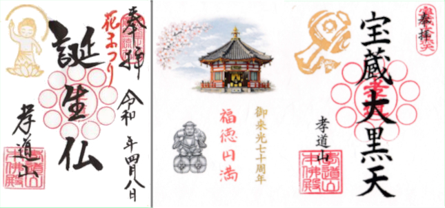 お釈迦さまのご生誕を祝う「孝道山花まつり」を記念して、期間限定で「幸守り」と「花まつりのご朱印」を頒布いたします。桜咲く孝道山の参拝記念にお受けください。