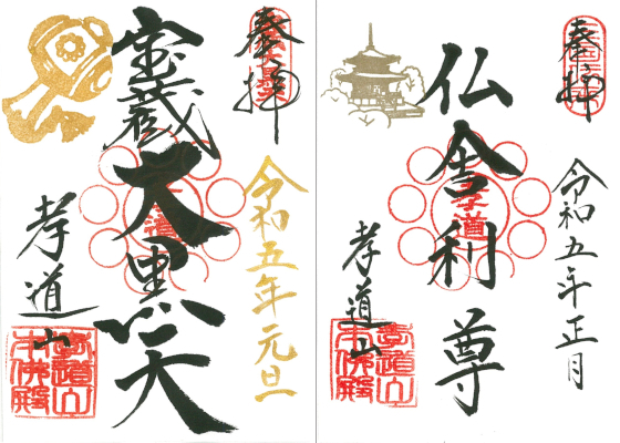 初詣で孝道山とご縁を結んだ証しに、特別なご朱印をお受けください。孝道山大黒堂横、札所で受け付けています。ご朱印帳も各種頒布しています。