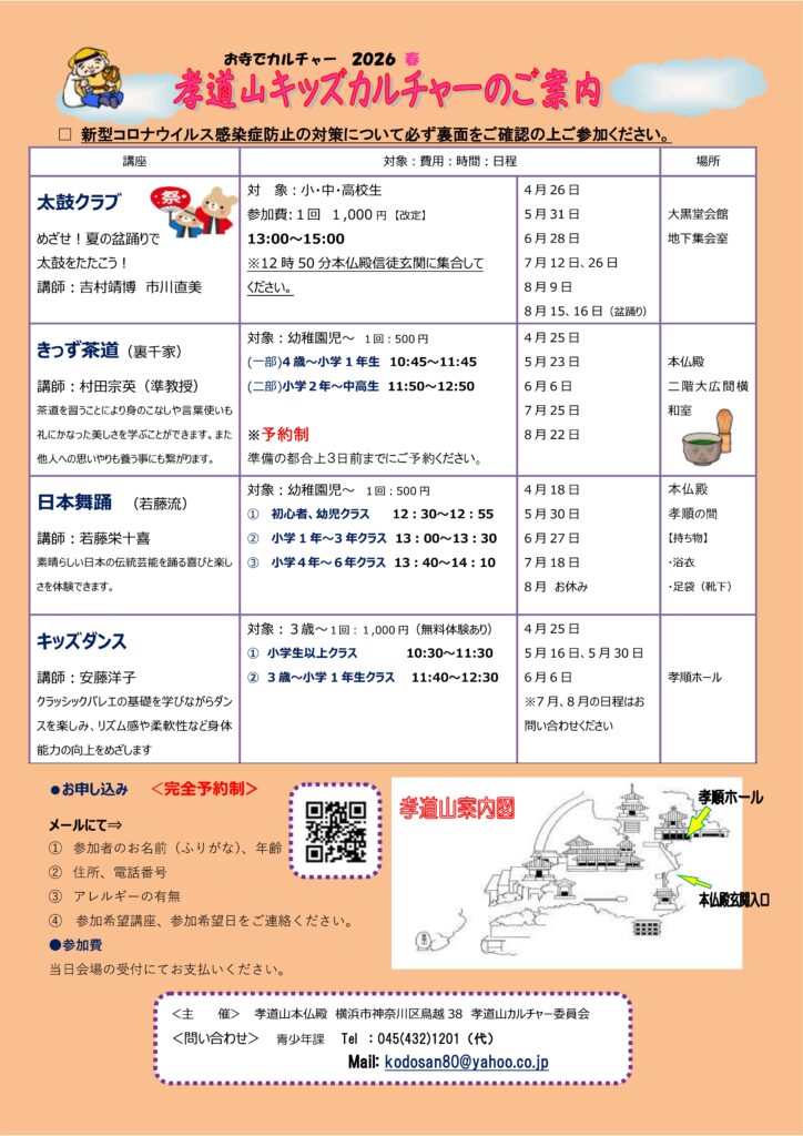 キッズカルチャー会員募集中! 2026.03.11 Post Share Hatena LINE RSS feedly Pin it note こどもサンガ*新年度募集! お釈迦さまのご生誕祝う花まつり 新着のお知らせ お知らせ一覧 2026.03.31 夏季仏教文化講演のお知らせ 2026.03.30 孝道山 桜の開花状況 2026.03.19 第74回孝道山花まつり 写真コンクールのご案内 2026.03.14 福徳おみくじ写経 2026.03.12 お釈迦さまのご生誕祝う花まつり