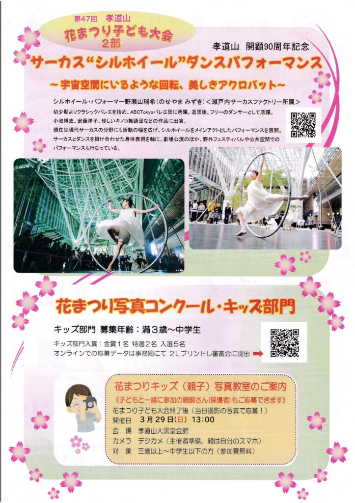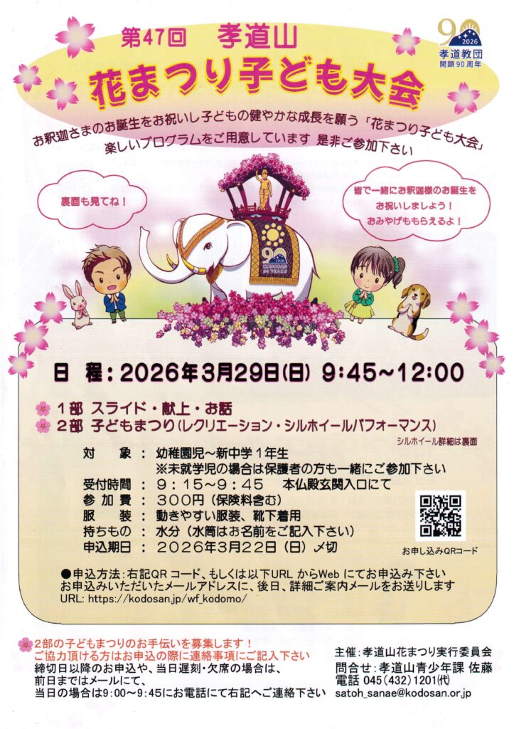 花まつり子ども大会 2026.03.05 「花まつり子ども大会」のお申し込みはコチラ 子ども大会申込フォーム – 孝道山 Post Share Hatena LINE RSS feedly Pin it note 第74回孝道山花まつり 写真コンクールのご案内 新着のお知らせ お知らせ一覧 2026.03.02 第74回孝道山花まつり 写真コンクールのご案内 2025.12.19 年末年始は孝道山へ 2025.10.21 11/1福徳結縁時間変更 2025.10.09 第35回 大黒まつりのおしらせ 2025.08.08 舎利供大法要とご仏舎利御開帳